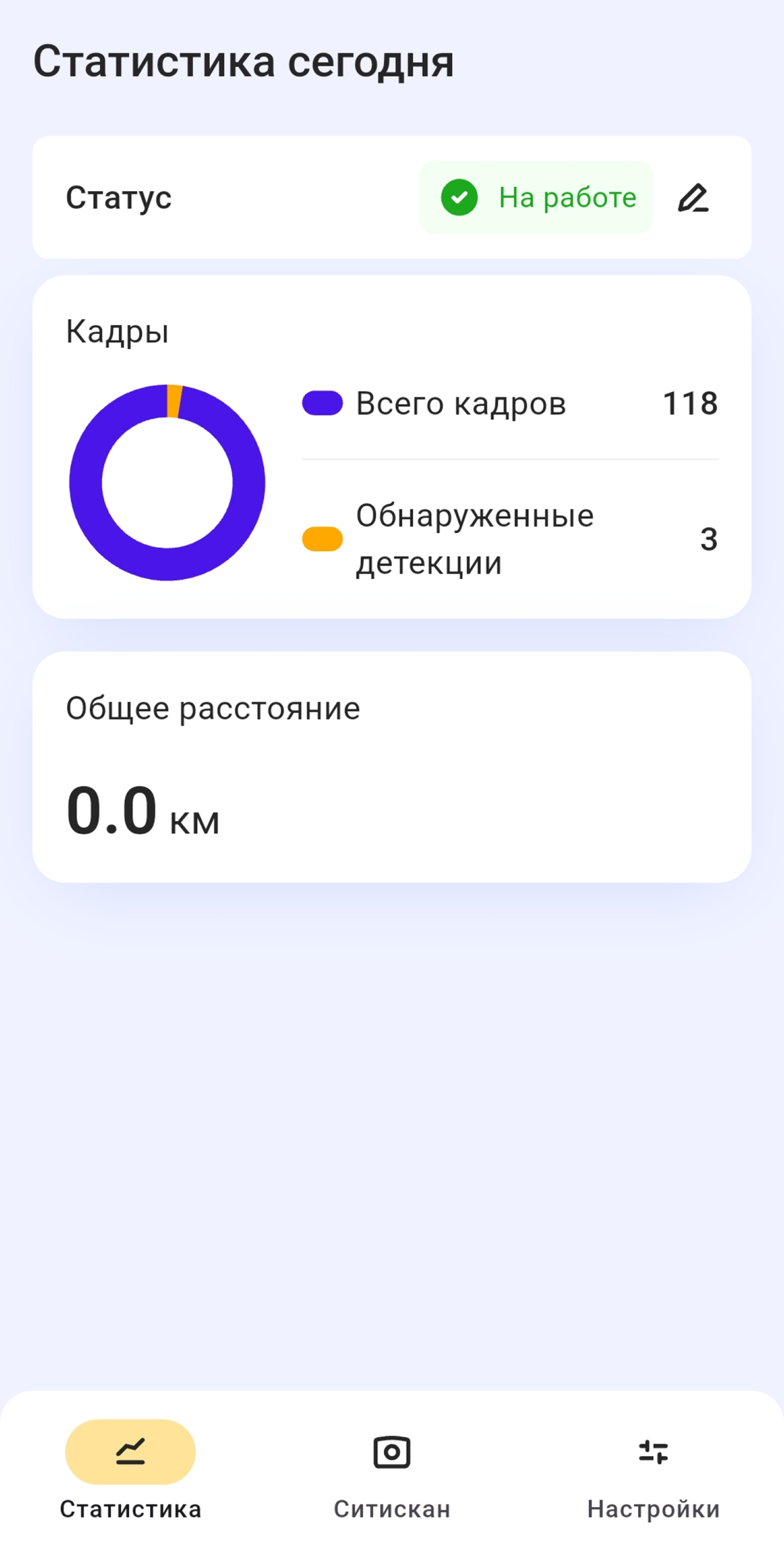 После загрузки данных перейдите на вкладку Статистика, чтобы увидеть обновлённые значения пройденного расстояния и количества записанных и загруженных кадров. Данные актуальны только на текущий день.