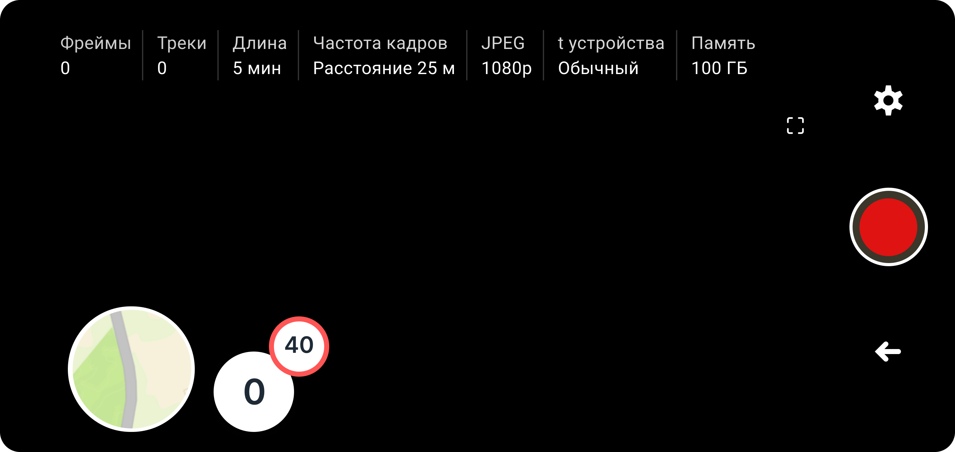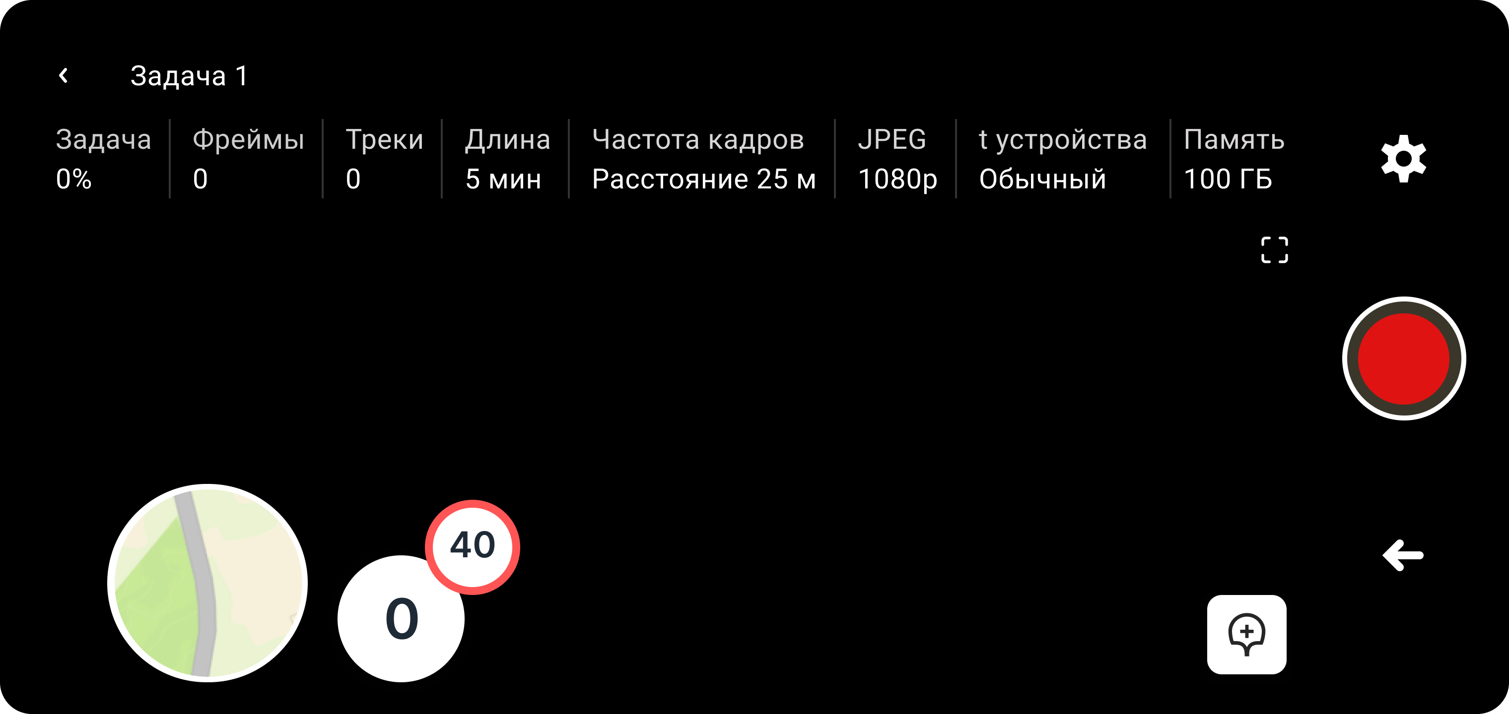 - Фреймы: количество кадров (изображений с привязкой к географическим координатам), записанных приложением, но ещё не загруженных для обработки. Во время записи видео кадры создаются автоматически в зависимости от настроенной частоты.