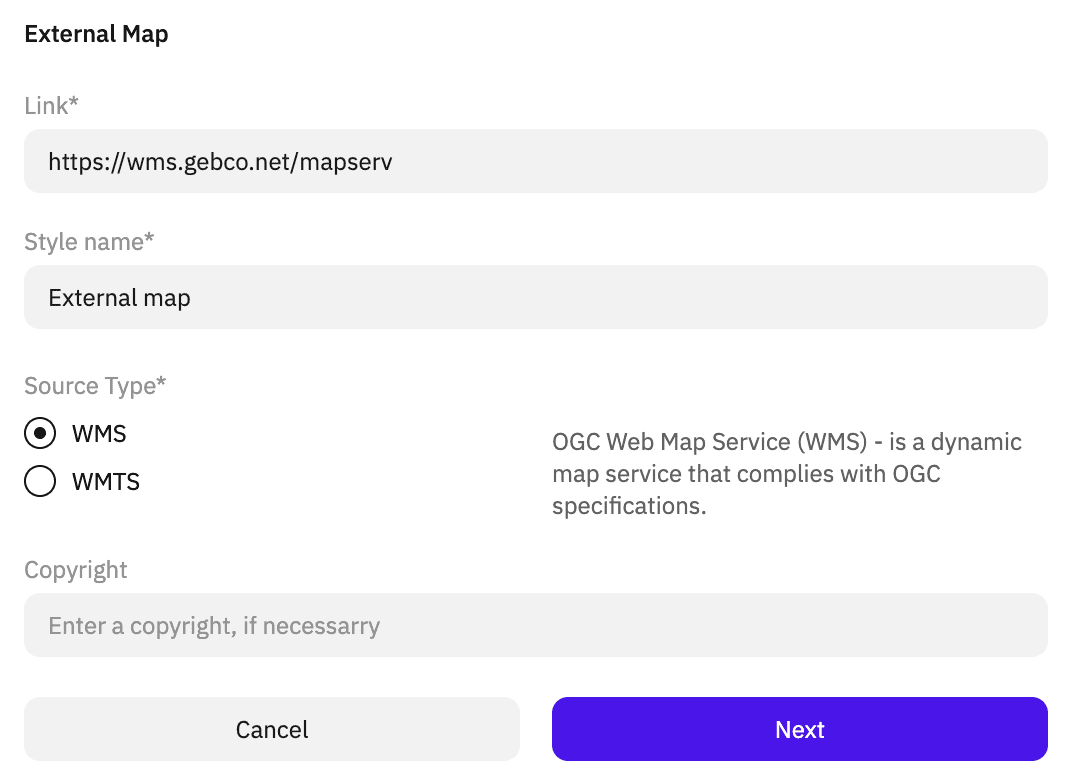 Copyright: copyright holder name. Add if the external source requires it. The text is displayed in the lower-left corner of the map.