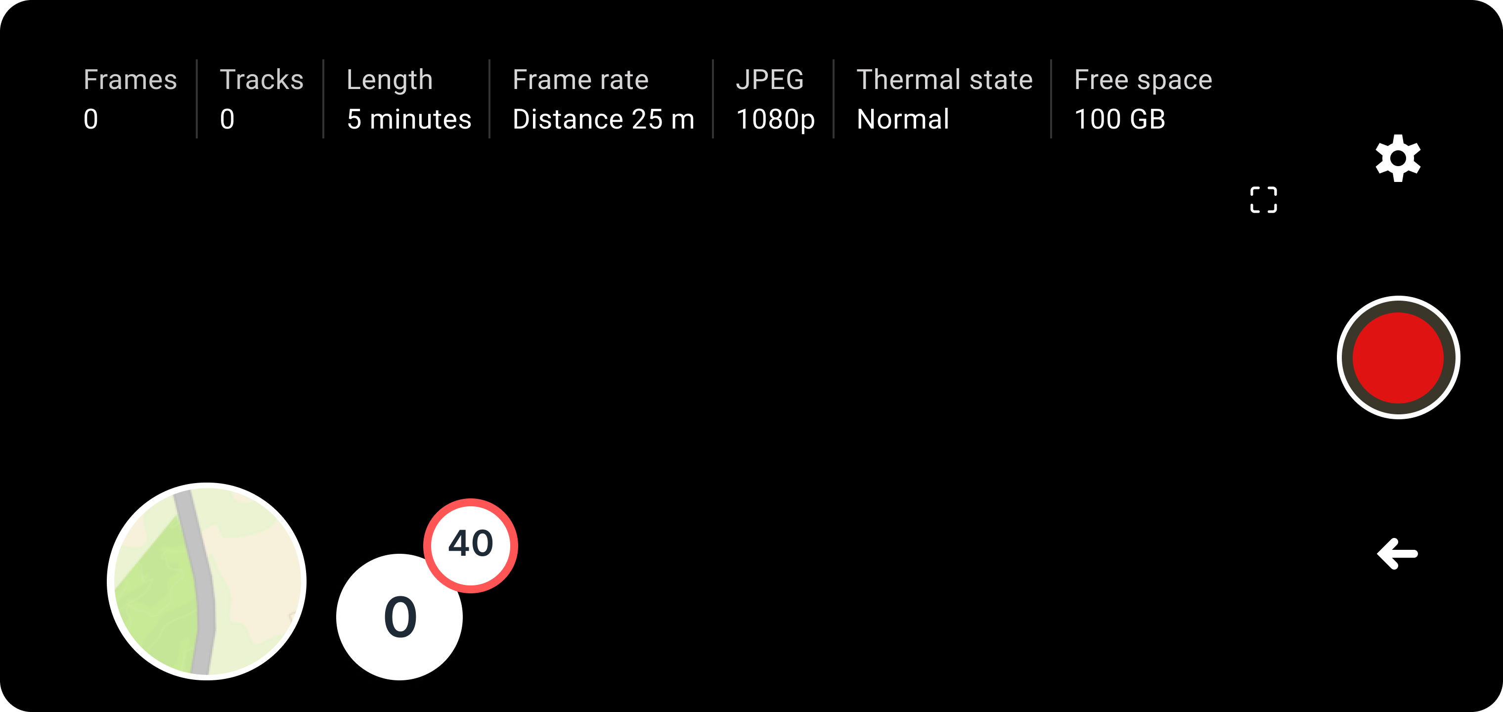 - Frames: number of frames (images bound to geographic coordinates) captured by the application and not yet uploaded for processing. When you record a video, frames are captured automatically depending on the configured frequency.