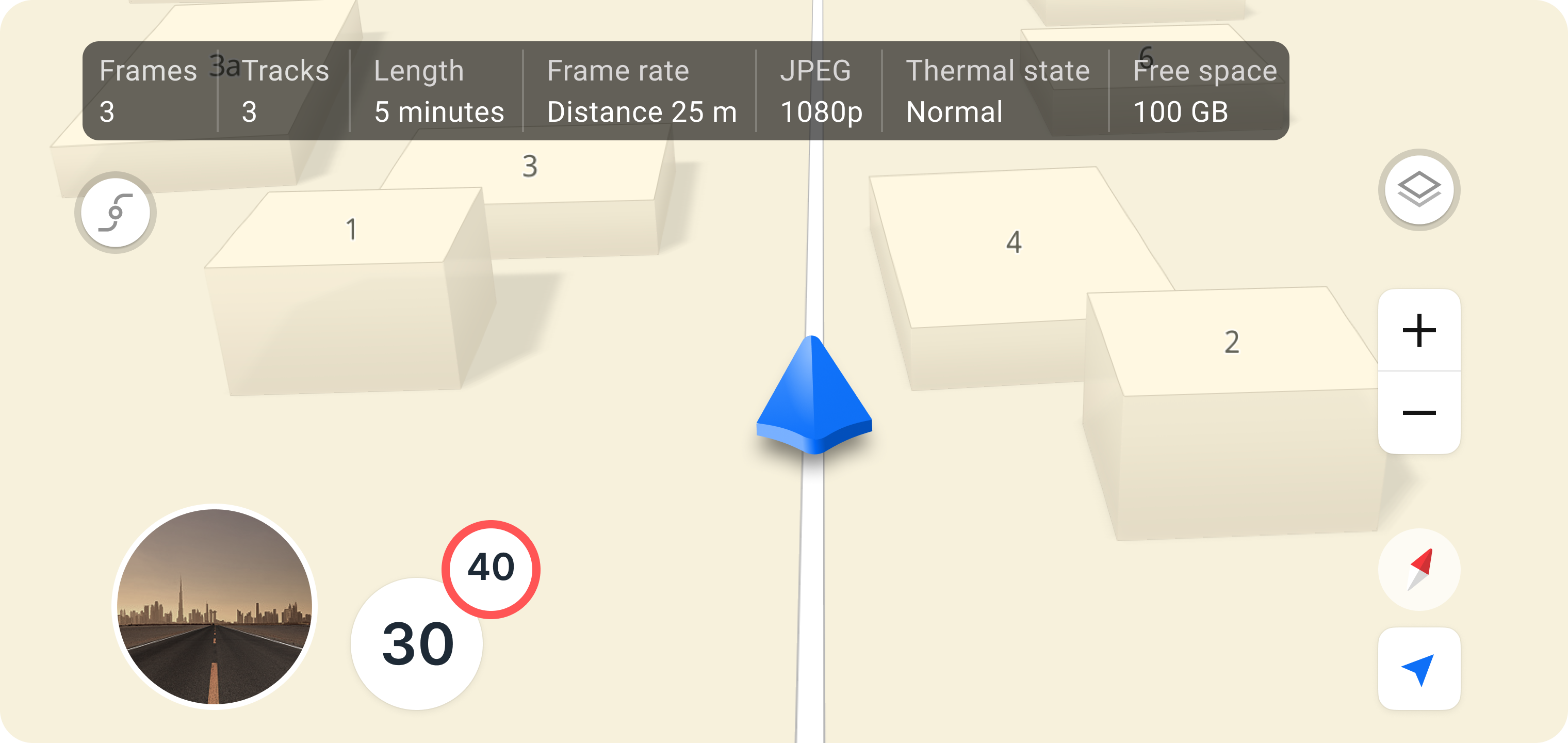 Free roam mode: driving an area without a specified route. In this mode, you can take photos or record videos. Internet connection is not required for data recording.