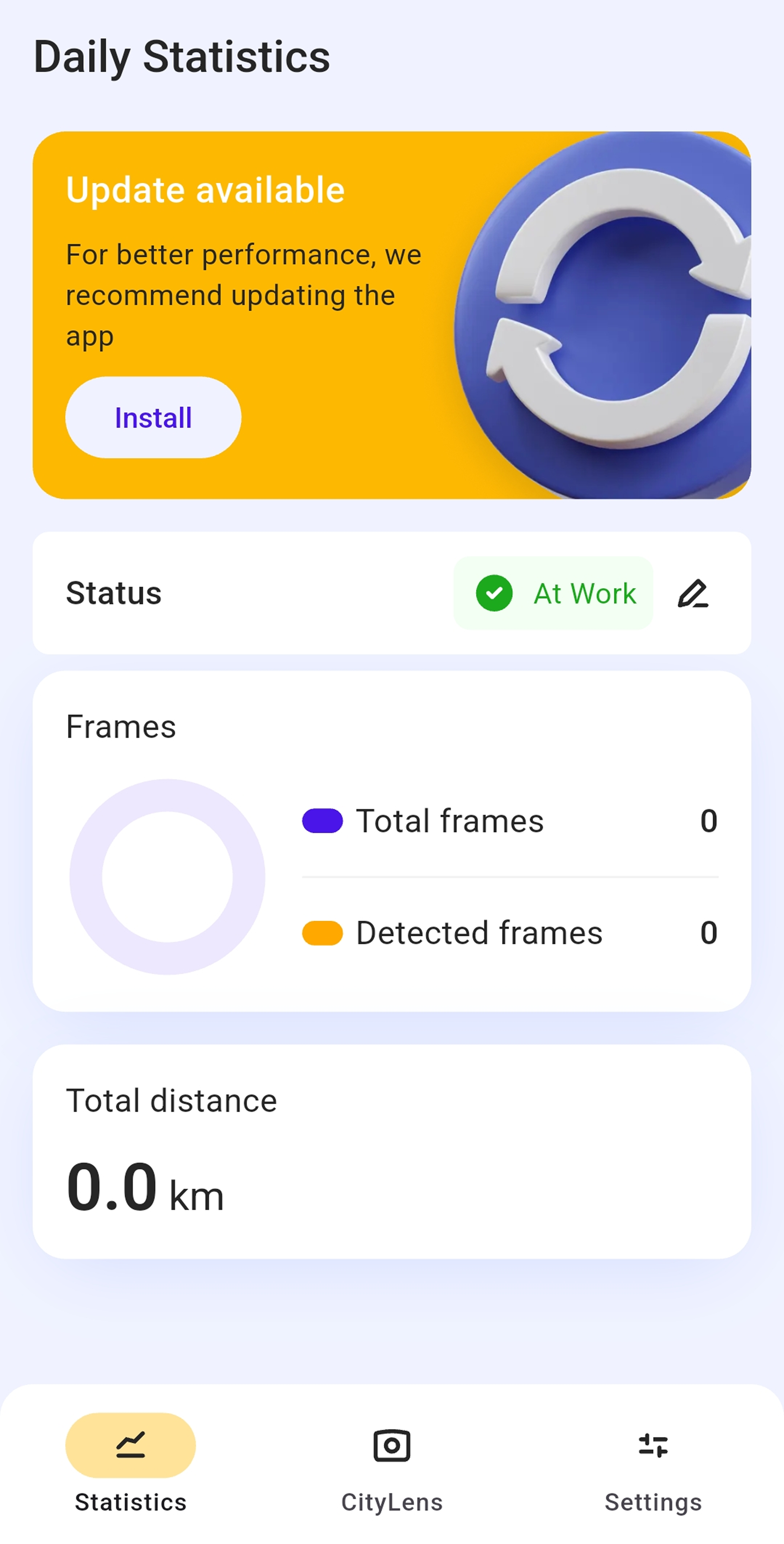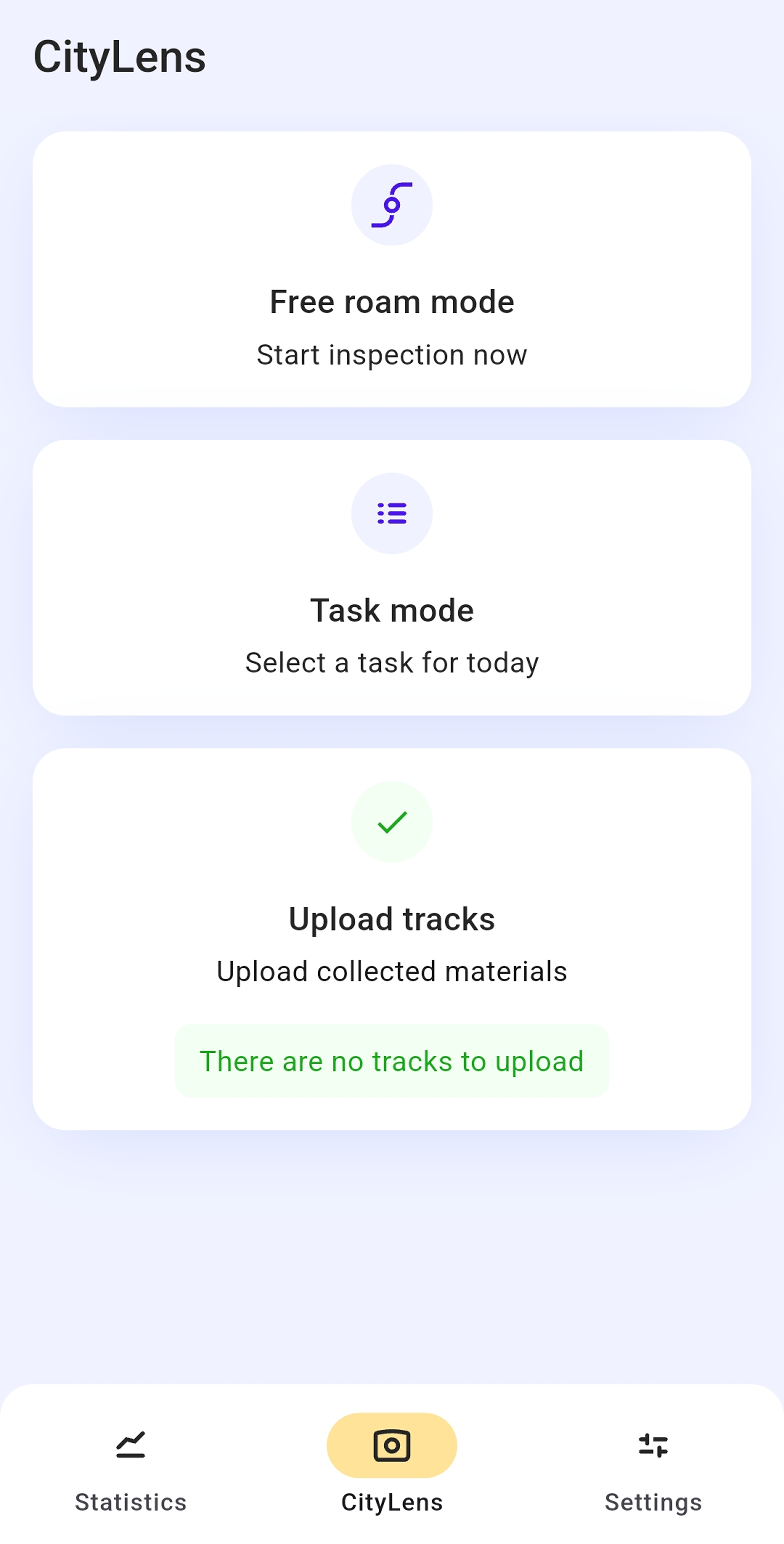 - CityLens tab where you can start recording in one of the modes or upload recorded tracks. For details, see the Recording data instruction.