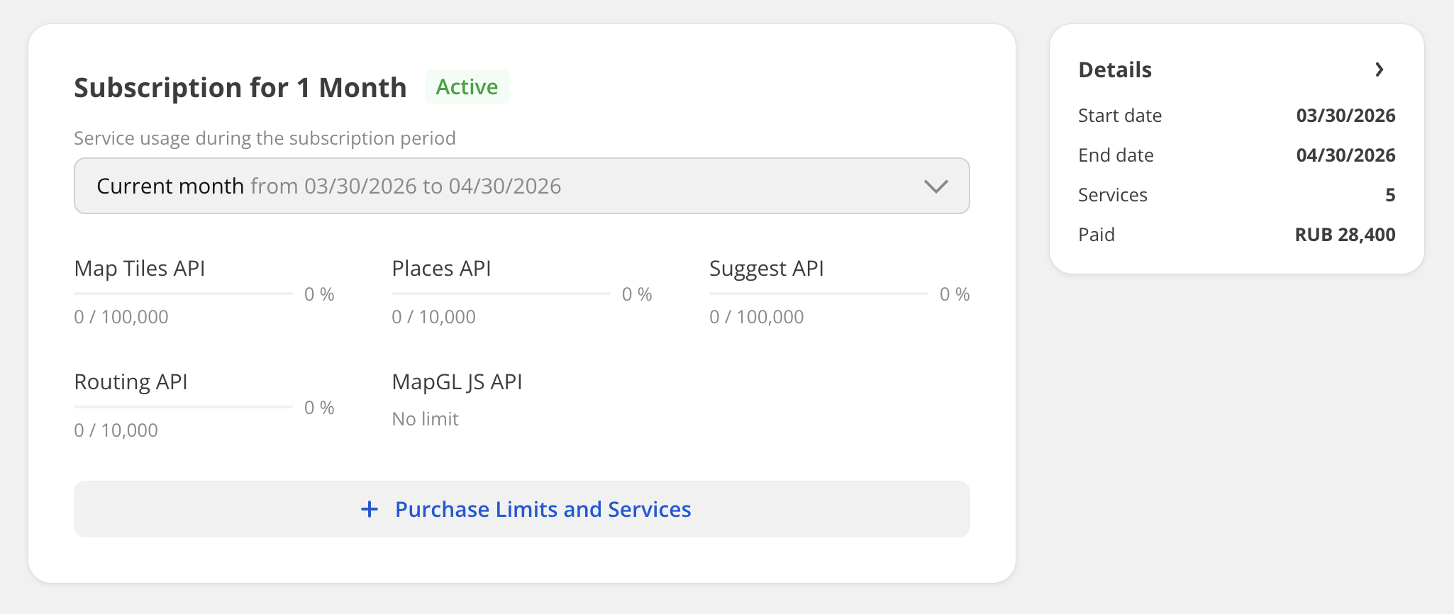 For your current active subscription, you can purchase additional services and limits on the number of requests or responses (depending on the service) per month. You can purchase additional limits and services an unlimited number of times.