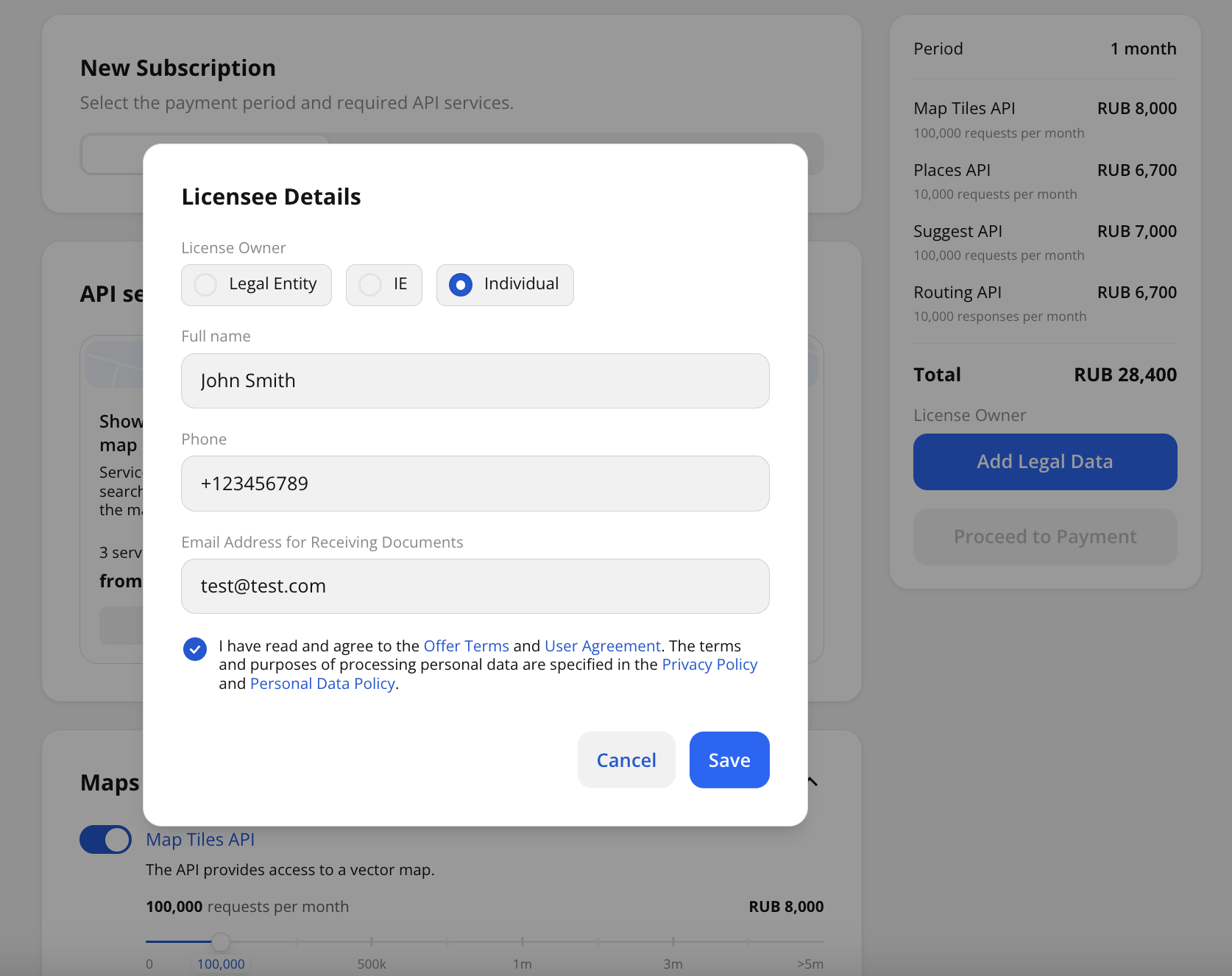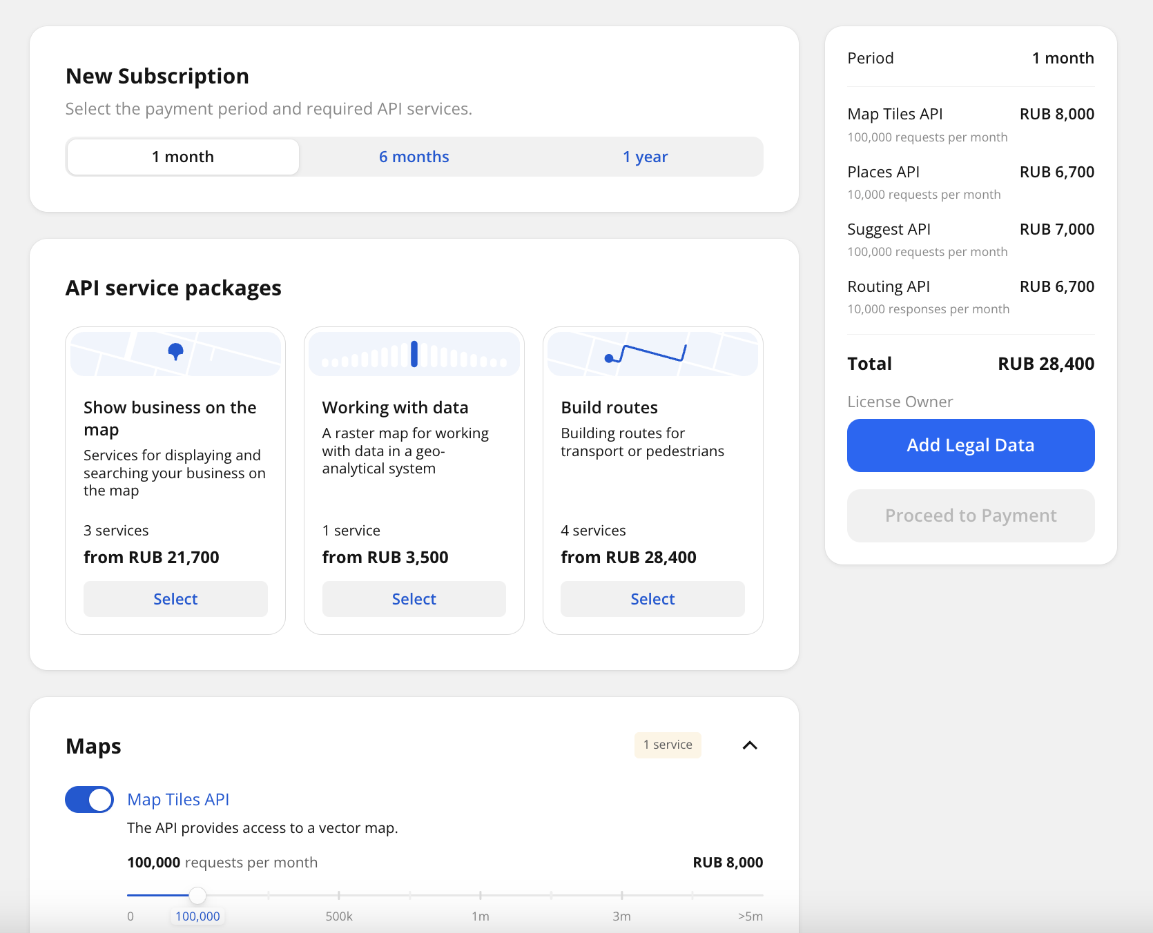 Select the services you need access to. For each service, specify the limit on the number of requests or responses (depending on the service) per month.