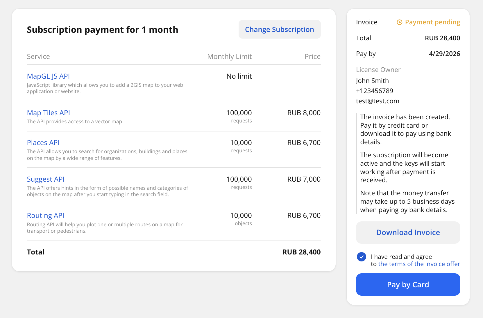 If you need to change the subscription conditions, click Change Subscription and specify new services and limits. Then click Proceed to Payment.
