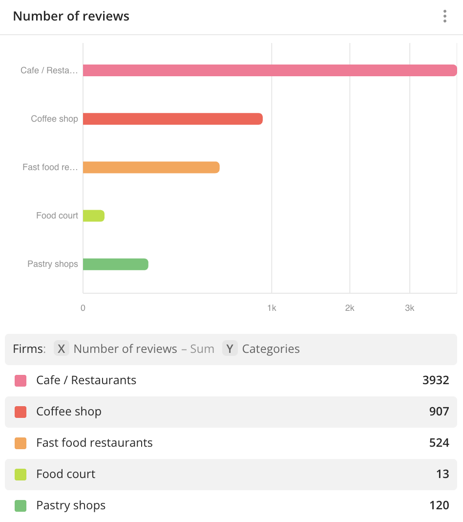 - Numeric attributes: for example, number of reviews, building area, and others. You can specify the number of ranges and their limits (and set ranges of different sizes) when creating a widget or editing it. In all ranges except the last one, the specified upper (right) limit is not included in the range. If you need to use a continuous scale and automatically set equal ranges of values (set a step size), use a histogram.