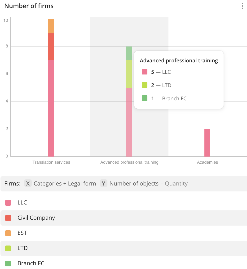 To compare values of a certain attribute by two parameters, use grouping by two levels. For example, you can compare the number of firms with different legal forms that belong to different categories: