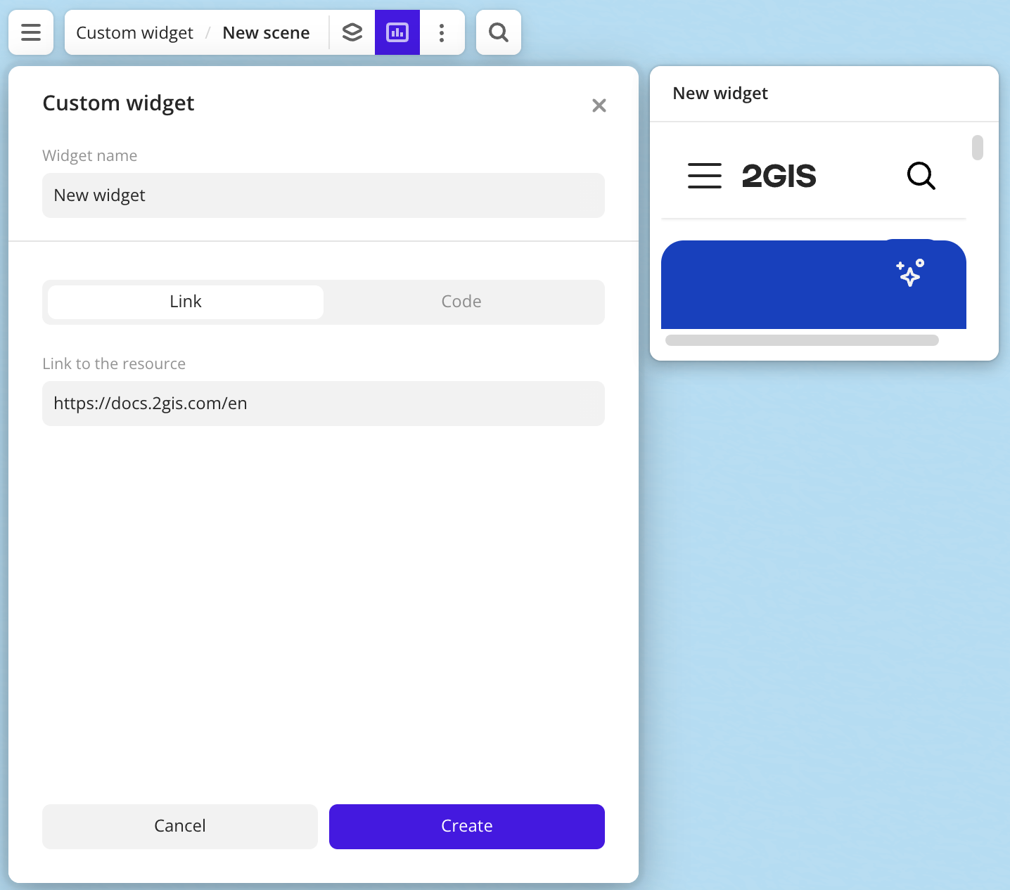 A custom widget allows you to embed frames (iframe) into dashboard scenes via a source URL or source code. Use a custom widget to add external resources or arbitrary elements to a scene.