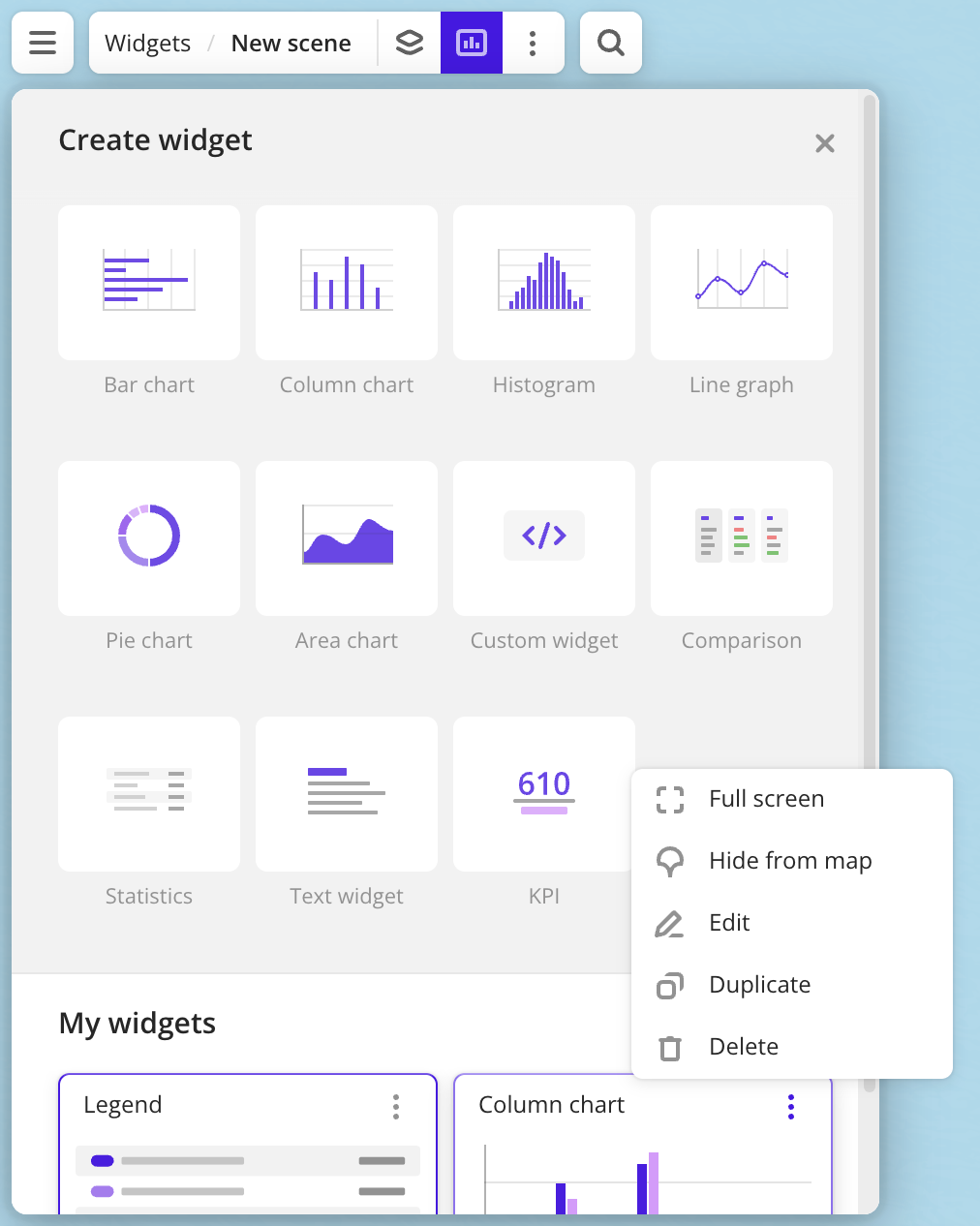 Operations below are available for all widgets except the system widgets. Some operations are available for the Legend system widget: opening in full-screen mode, hiding and showing on the scene, and renaming.