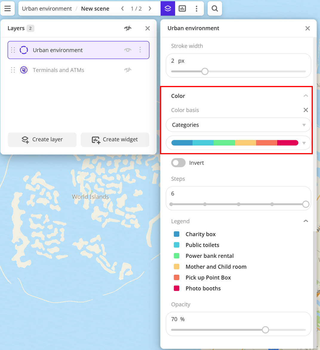 To analyze the number of objects of different categories, change the color of the points on the map depending on the category. In the Color basis field, select the