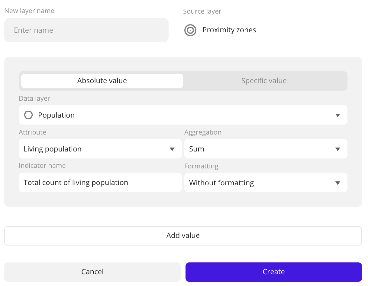 - Absolute value: sum, average, minimum value, maximum value, and others. Usage example: calculate the total count of residents or the average rating of competitors within a polygon or a 5-minute proximity zone.