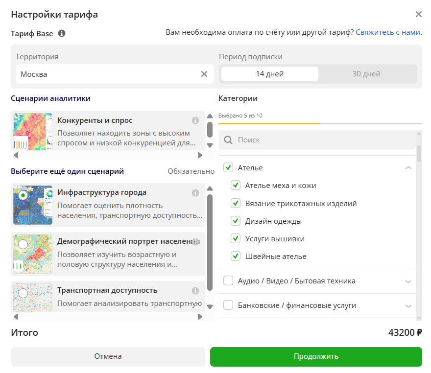 Data from over 1000 subcategories of organizations from the 2GIS directory is available for analysis (for example, the Food service category contains the Pastry shops subcategory). Select up to 10 subcategories of your interest when connecting the tariff.