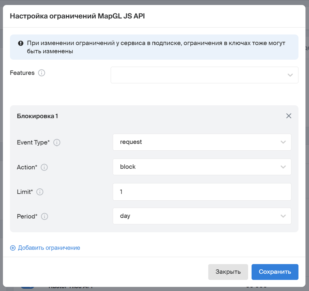 Ограничения применяются для всех сервисов, которые указаны в API-ключе.