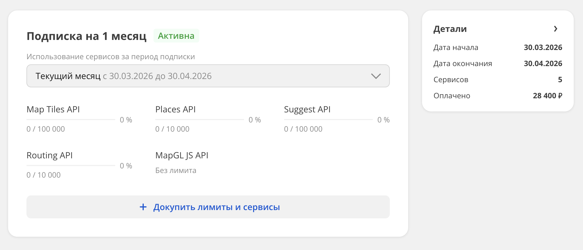 Стоимость докупки для каждого сервиса рассчитывается следующим образом: количество оставшихся платёжных месяцев (включая текущий) в текущей подписке умножается на стоимость выбранного количества лимитов в месяц. Например, вы приобрели подписку на 6 месяцев 02.12.2025. При покупке дополнительных сервисов 12.12.2025 будут учитываться шесть месяцев, 10.01.2026 — пять месяцев. Подробнее о ценах см. в инструкции Тарифы.