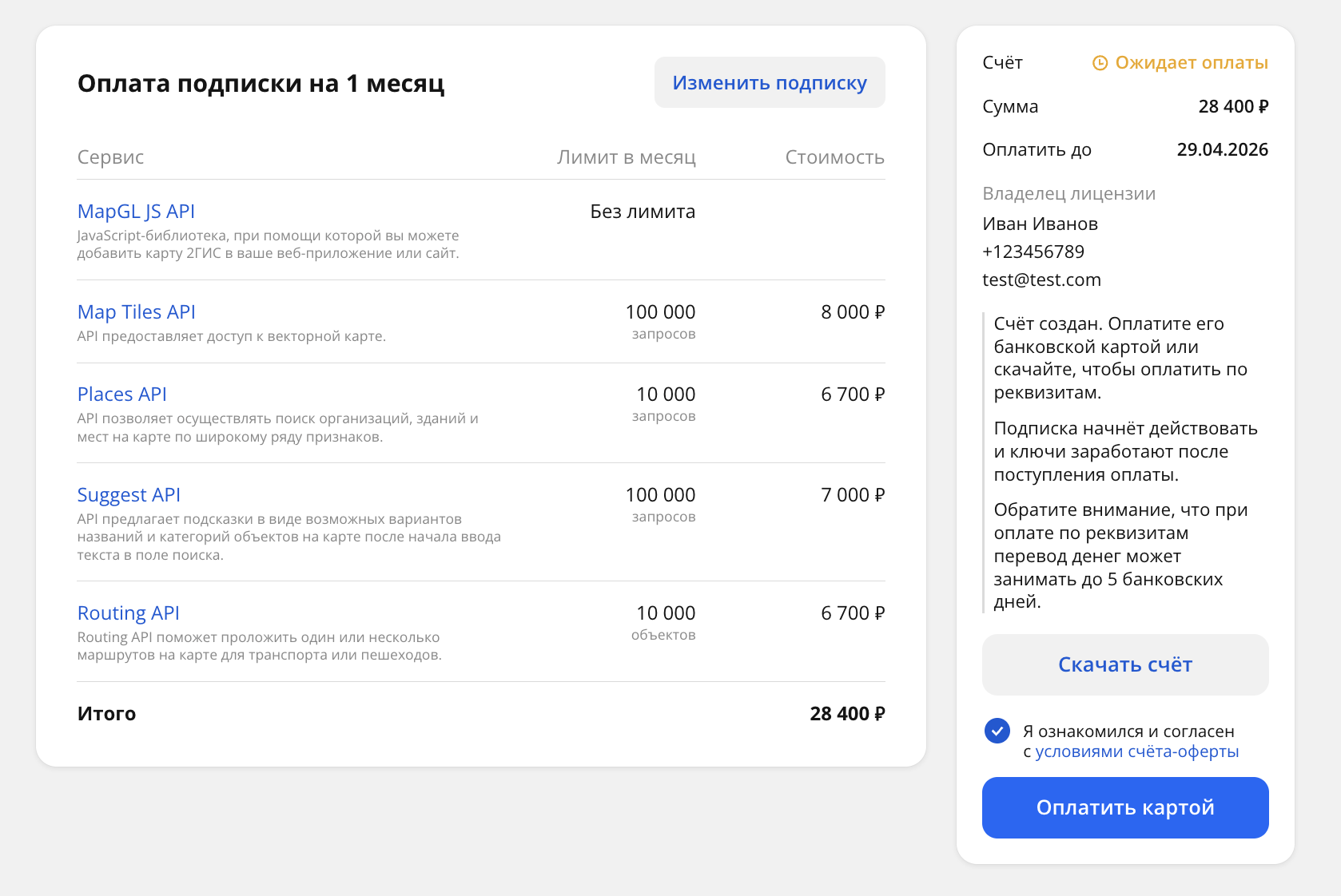 Если нужно изменить условия подписки, нажмите Изменить подписку и укажите новые сервисы и лимиты. Затем нажмите Перейти к оплате.