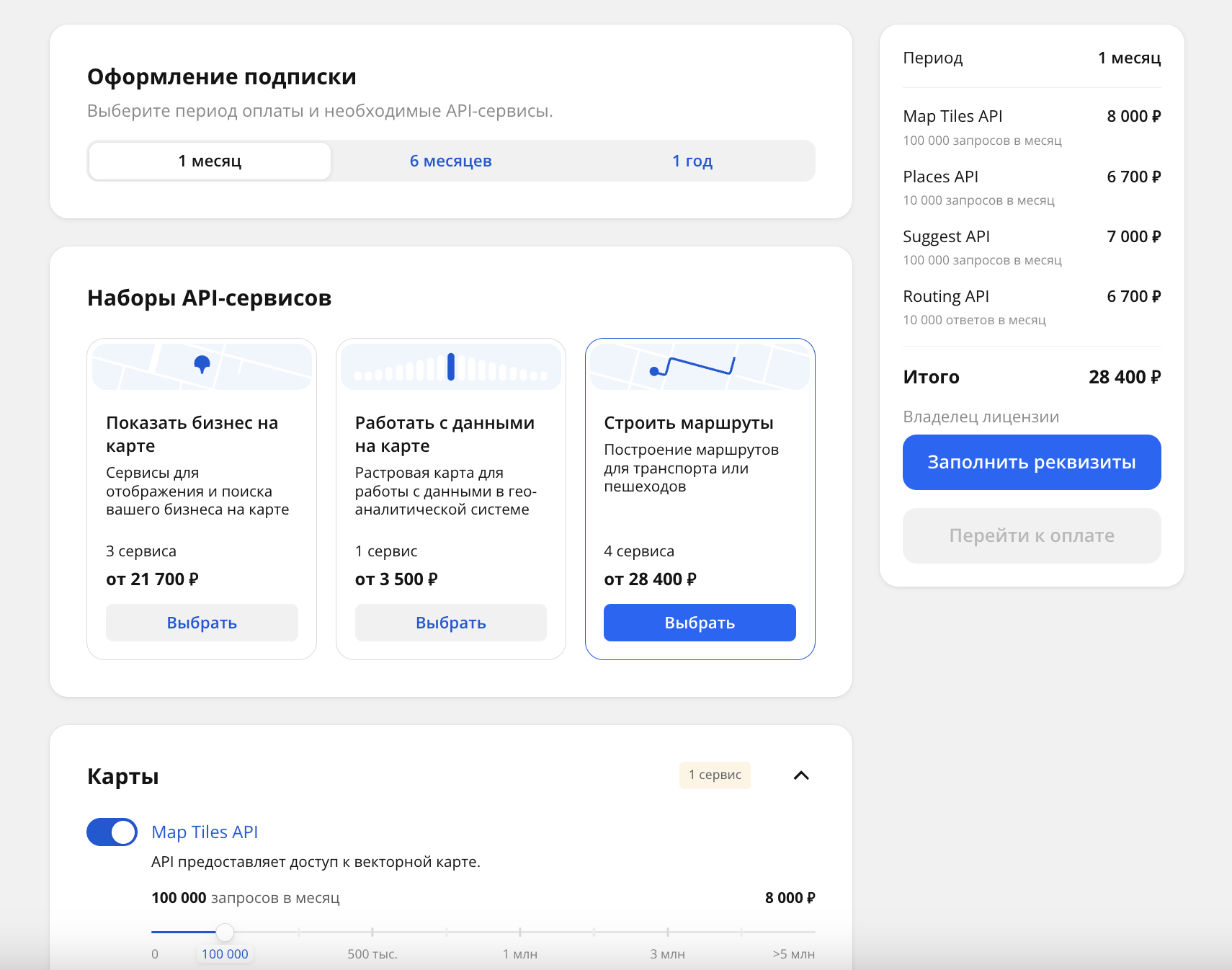 Выберите сервисы, к которым нужен доступ. Для каждого сервиса укажите лимит на количество запросов или ответов (в зависимости от сервиса) в месяц.