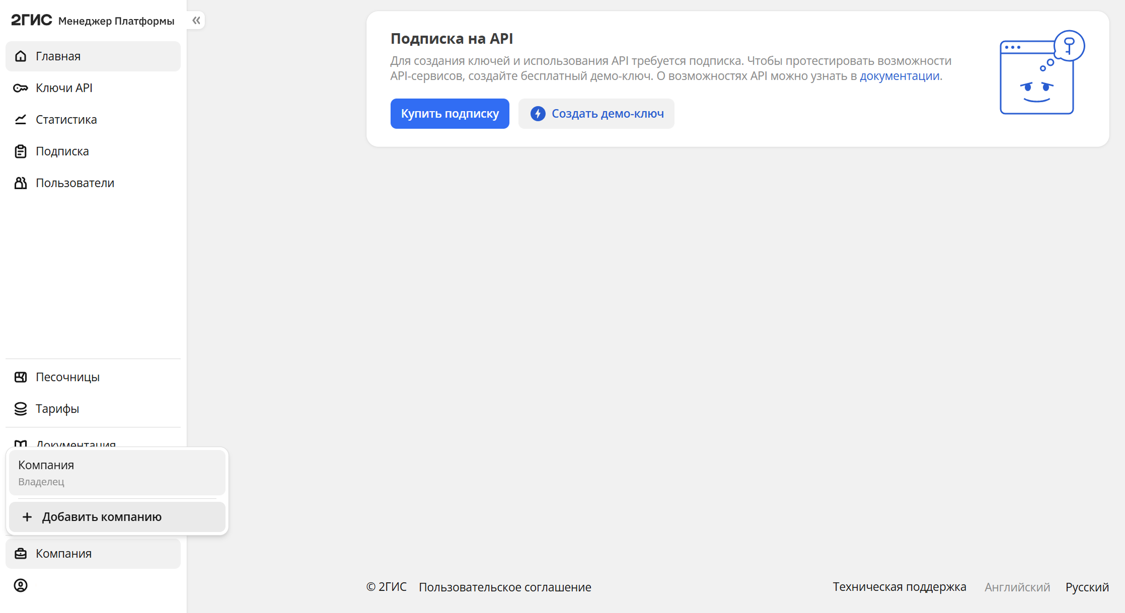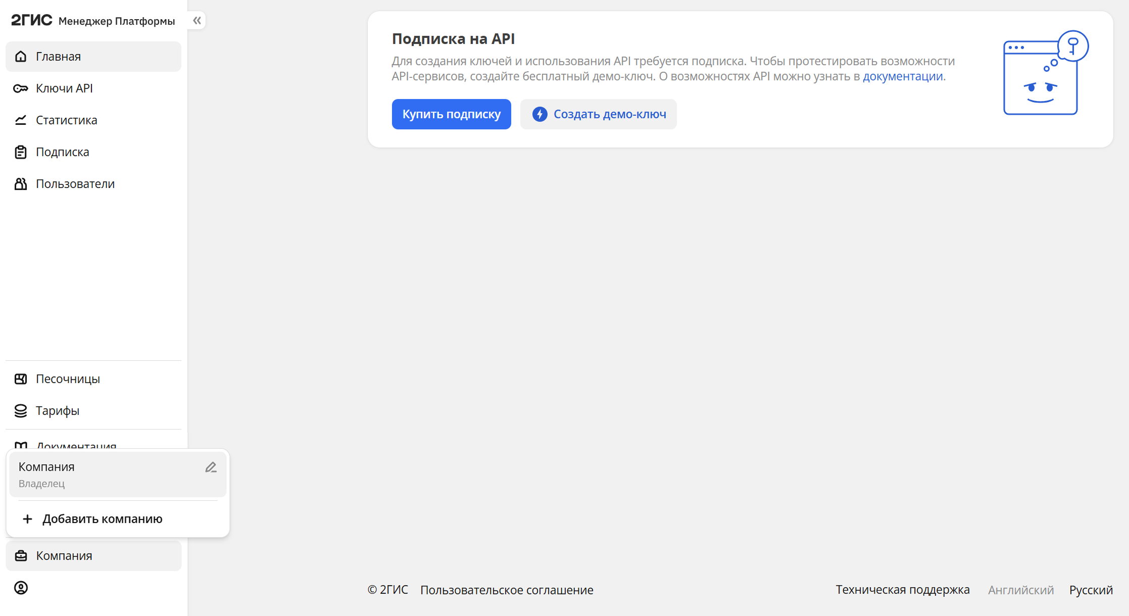 После создания компании вы автоматически получите роль Владелец для неё и сможете пригласить пользователей, оформить подписку и создать API-ключи.