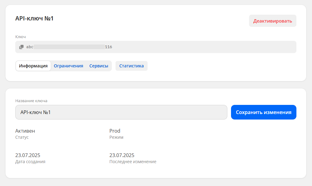 Подробнее об управлении ключами см. в инструкции Управление ключами доступа. Также вы можете посмотреть статистику расходования лимитов и распределения запросов.