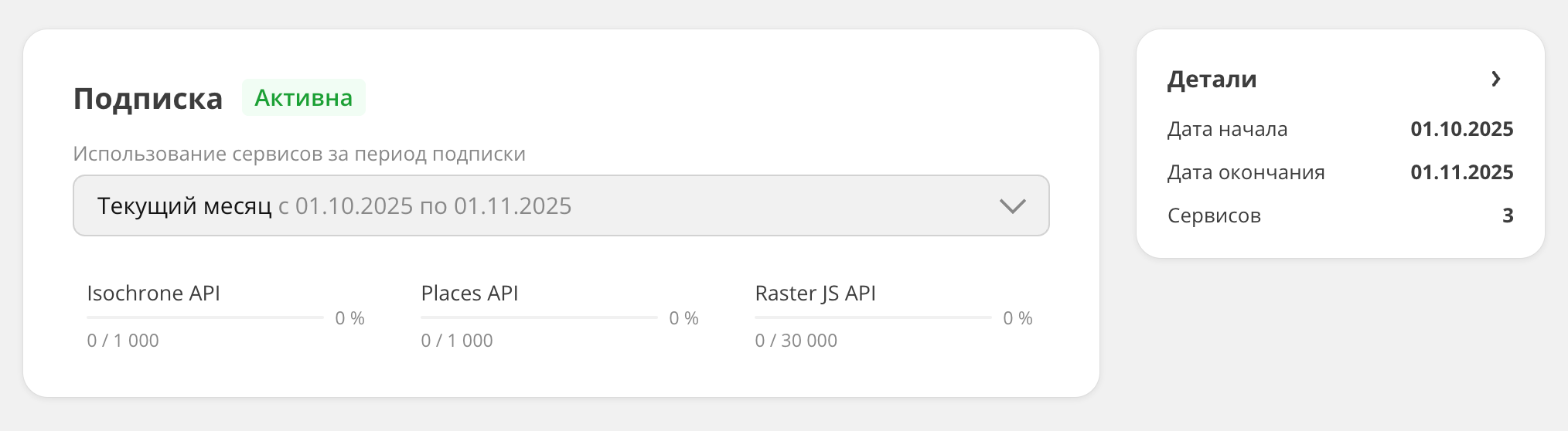 В личном кабинете Менеджер Платформы вы можете просматривать прогресс расходования лимитов в подписке, а также детальную статистику распределения запросов к сервисам через API-ключи.